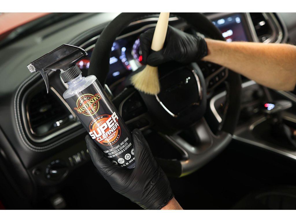 Vysaj nasucho prach - nastříkej Super Cleaner zředěný 1:20 na celý povrch sedadla – nech chvíli působit – čisti jemným kartáčem – vysaj extraktorem nebo vytři mikrovláknem – pokud je potřeba tak postup opakuj, lze použít silnější ředění 1:10 - znovu vsaj mokrým vysavačem – nech vyschnout.